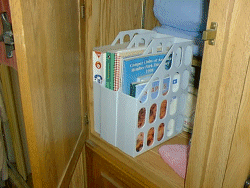 Here's a cheap and simple solution to keeping those reference books in order. A couple of inexpensive plastic magazine files attached to the inside of a cabinet works great! I attached them with a couple of screws, but velcro or double-sided sticky tape would work too. Simple and effective... Keeps the books undamaged and right where you can reach them! | ![]() |
