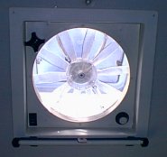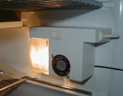 To keep the inside of the fridge at a uniform temperature, you can buy one of those little battery powered fridge fans or try this slick little project. If your fridge has a light fixture similar to this, you can cut a small hole and install one of those tiny little fans used to cool computer processors. These fans are about 1.5 inches square and draw less than a tenth of an amp of 12V power.. There's already 12V power available right in the light fixture and it's easy to install a small switch to turn off the fan when the fridge is not in use. The fan blows air out into the fridge compartment and circulates the air nicely, keeping everything uniformly cool inside. Mine has been running nonstop for more than 3 years and continues to work great. These little fans are available from many electronic surplus stores for about $5 - $7 bucks. If you can't find one, try All Electronics Corp. They have an online catalog at www.allelectronics.com |