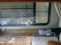 Buy the stuff. It's available at most home supply stores and hardware stores. | Apply the sticky tape onto the metal frame around the window. | Place the clear plastic film loosely over the window and stick it to the tape. |