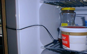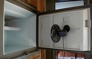 To defrost the freezer, turn off the fridge and relocate all the frozen items into the refrigerator compartment. It helps to put the frozen items all together in a bag and, of course, it's a good idea to do this when your stock of frozen stuff is running low.... Now prop the freezer compartment door open and place your trusty little fan to blow air into the freezer. It's amazing how fast this works.... on a warm day, it will only take an hour or so to loosen all the accumulated frost and ice. Plus, there's no chance of damaging the freezer compartment by scraping or by using a heat source like a blow dryer. My little fan has a suction cup that works just great to stick it to the open freezer door. Keep an eye on it so that the melt water doesn't overflow and make a mess! The bag of frozen stuff will keep the food cold in the fridge and won't have time to defrost to any serious extent. After the ice is gone, dry the inside of the freezer compartment, close the door and turn the fridge back on and set it to 'Max'. Once the freezer cools back down, you can move all the frozen items back in. Remember to turn the fridge back down to the normal setting! | ![]() |