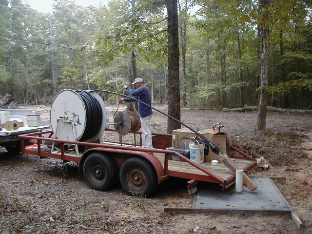 Since there's no water on the property, they brought a large tank along to supply water for the drill. Pumps recirculate the water through the drill, and sand separators extract the sand and clay, keeping the fluid from thickening too much. It's really a fascinating process. They went down about 200 feet... it was solid clay all the way until they hit the aquifer, which is sand and gravel.