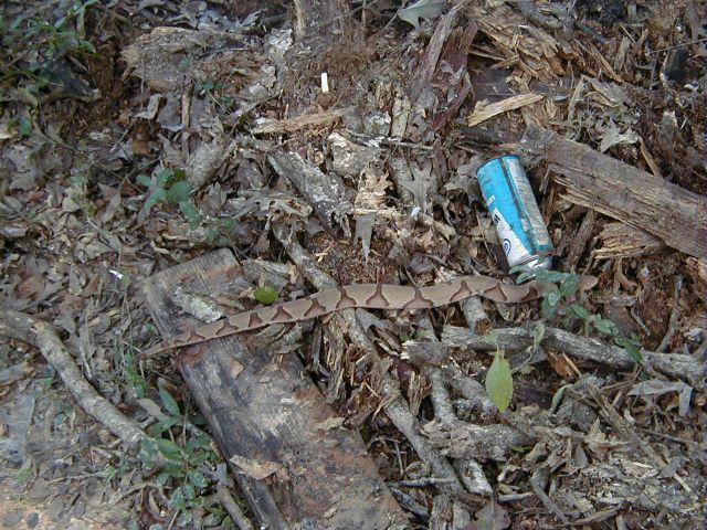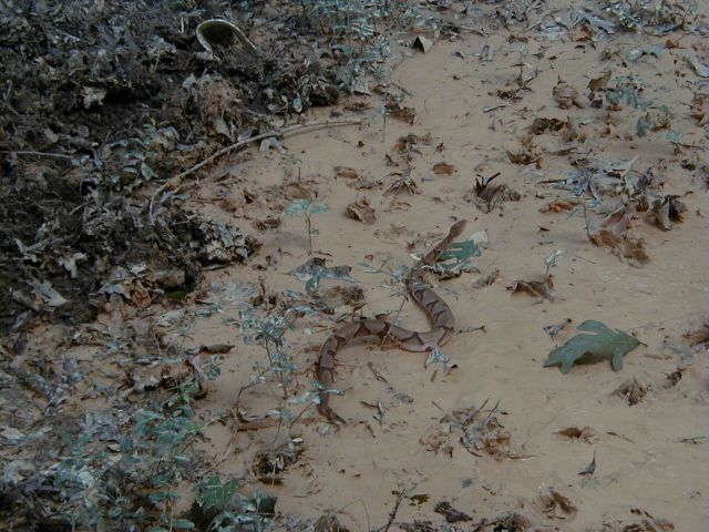 While I was working on the well house, I spotted a large snake cruising by just a few feet away... This is a really healthy example of an East Texas Copperhead.. Not a snake you'd want to step on! There are a lot of snakes around here, so you really have to pay attention when you go walking around, especially after dark!