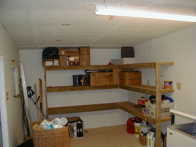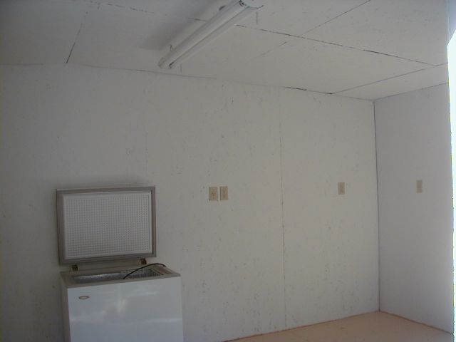 Once I had the inside finished, I built some hefty shelves to allow me to store all my junk when it got out here from California. I also moved a small freezer in and strung a temporary power feed overhead from the power pole, some 130 feet away. Wow! I've got power and lights!!!