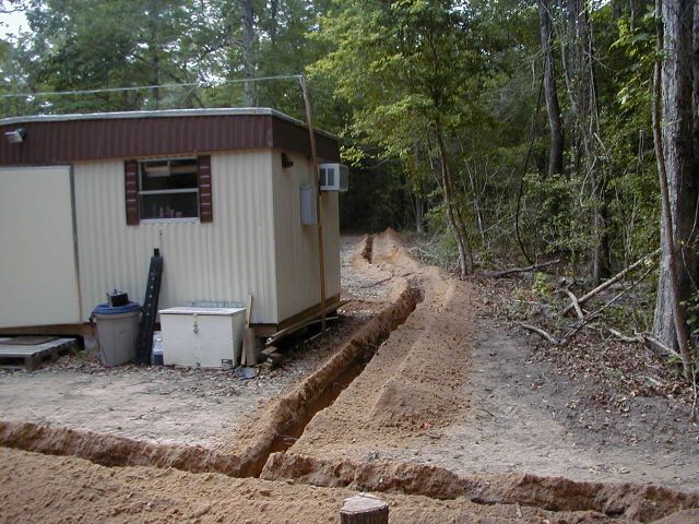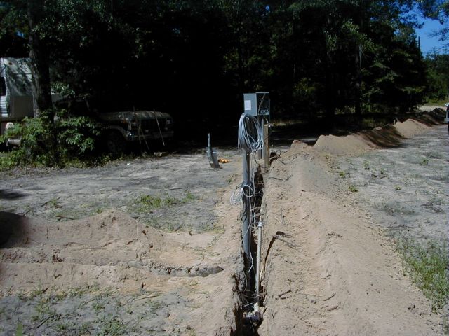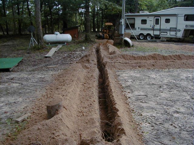 I wanted to trench both water and power to all the ends of the property, so I started measuring and drawing up materials lists. All told, I sank about 600 feet of 1" water line and a similar amount of wire. I ran phone and data cable in all the trenches and also the 50 amp main power feed for the shop. I used conduit for most of it and even added some extra lengths under any area that I anticipated putting a concrete slab in. I also sank a long run of 2 1/2" conduit and installed a meter loop and disconnect box and had the main utility power brought in underground. It was a big project, and I wound up taking most of a week off to get it all done.